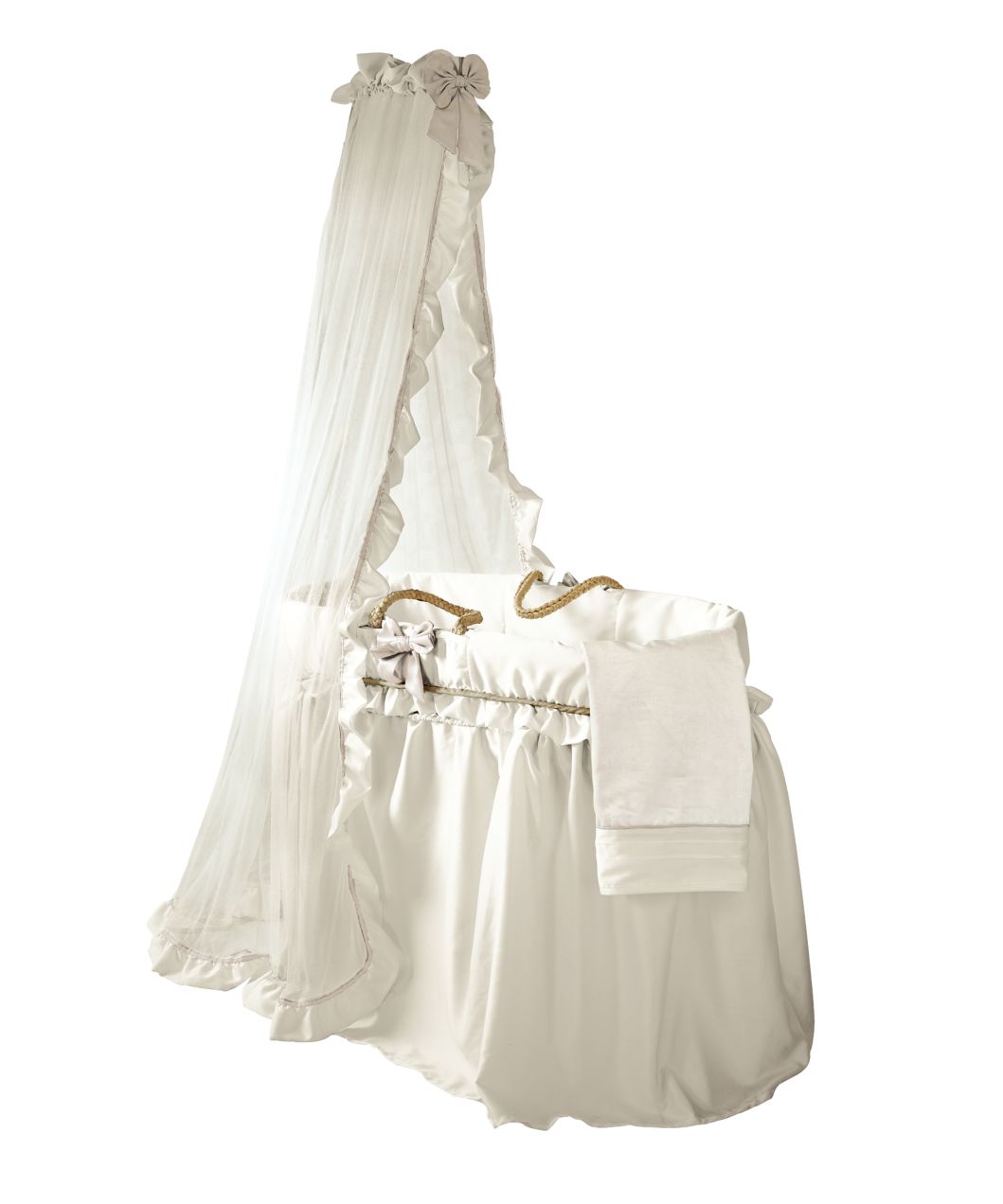Grey Wicker Moses Basket Drapes Sparkling Muslin White Drapes